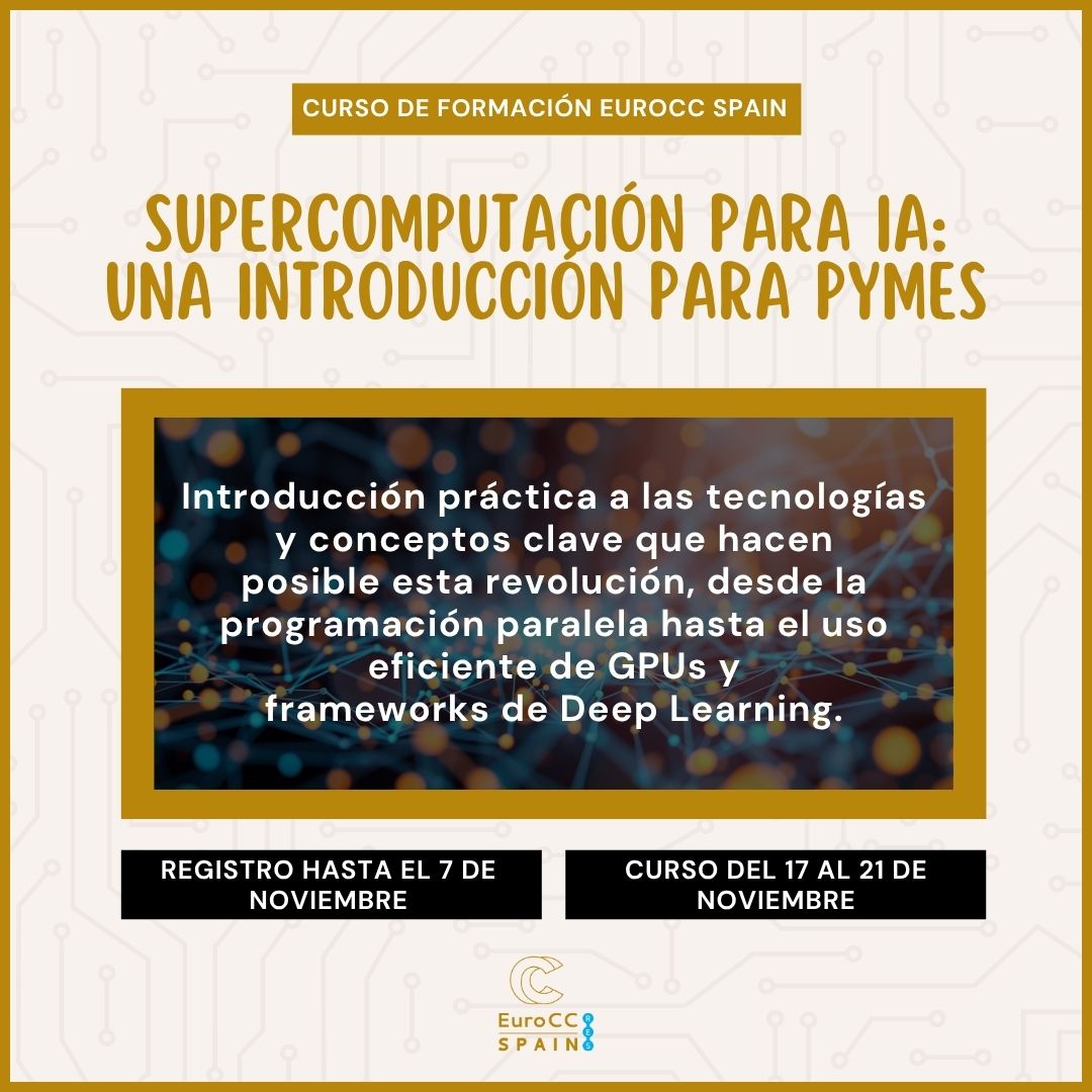 REGISTRO ABIERTO Detalles de la jornada SUPERCOMPUTACIÓN PARA IA: UNA INTRODUCCIÓN PARA PYMES La inteligencia artificial moderna se apoya en la supercomputación para entrenar y ejecutar modelos cada vez más complejos. Este curso de EuroCC Spain RES ofrece a las pymes una introducción práctica a las tecnologías y conceptos clave que hacen posible esta revolución, […]